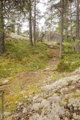 Fototapeta premium Winding footpath through a quiet pine forest, covered in moss and lichen,...