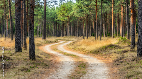 Obraz premium Winding forest path, golden sunlight, tranquil scene