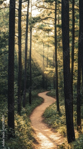 Fototapeta premium Winding Forest Path Lit by Sunlight Through Tall Trees Serene Nature Walk...