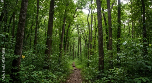 © KASHAF MAQSOOD, Obraz premium Winding forest path through lush green trees invites exploration and provides peaceful escape