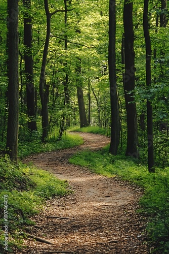 Obraz premium Winding forest path through lush green trees, summer nature landscape photo