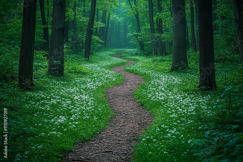 © Myartsam Design, Obraz premium Winding Forest Path Through White Flowers