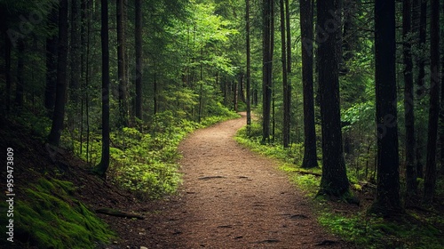 © Ariestia, Fototapeta premium Winding Forest Path with Sunlight Dappling Through Trees