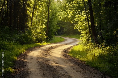 Fototapeta premium Winding forest path with sunlight shining through the trees