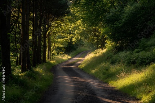 Fototapeta premium Winding Forest Path with Sunlight Through Trees