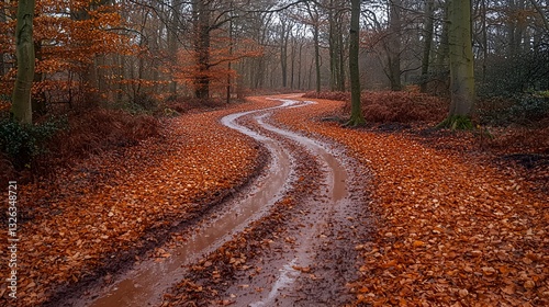 Obraz premium Winding forest road in autumn, covered in mud and fallen leaves, serene,...