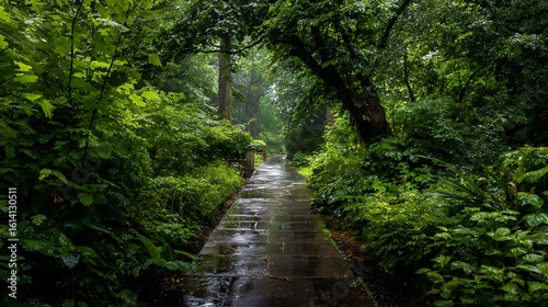 Naklejka premium Winding forest road in rainy green woods / 雨の緑の森を曲がる小道