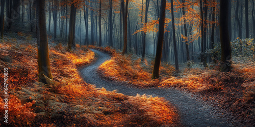 © Laiba, Obraz premium Winding forest trail under glowing beech foliage in Belgium
