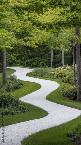 © Enggal Pitoyo, Fototapeta premium Winding gravel path through lush green garden