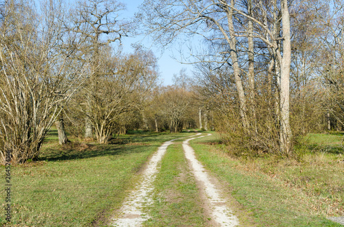 Fototapeta premium Winding gravel road by spring season in a green landscape