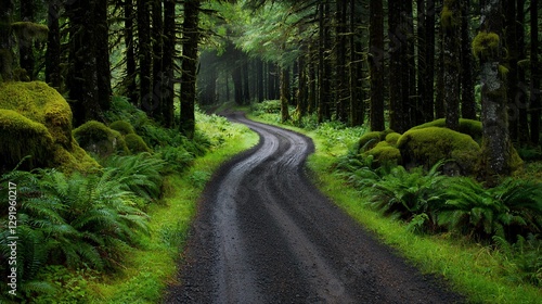 © Arc std., Obraz premium Winding gravel road through lush, mossy forest.