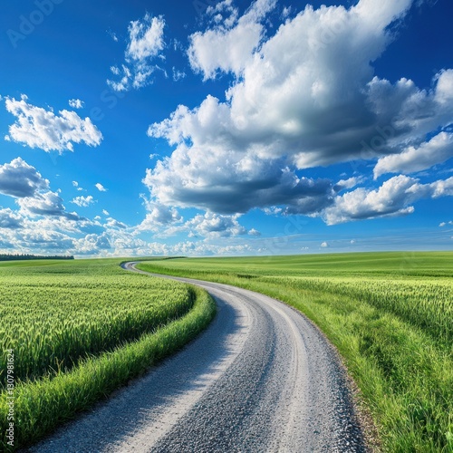 © andi, Obraz premium Winding gravel road through summer field, blue sky