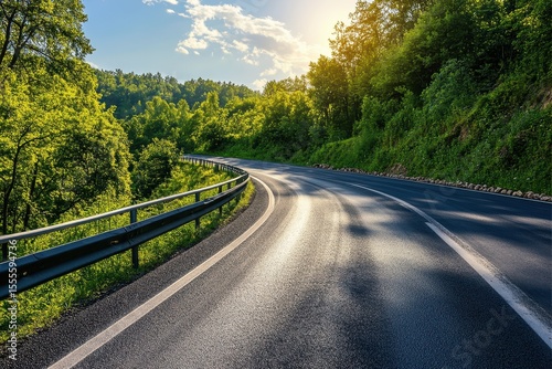 Fototapeta premium Winding highway through lush greenery under a bright sky with sunlight shining on the road and crash barriers alongside