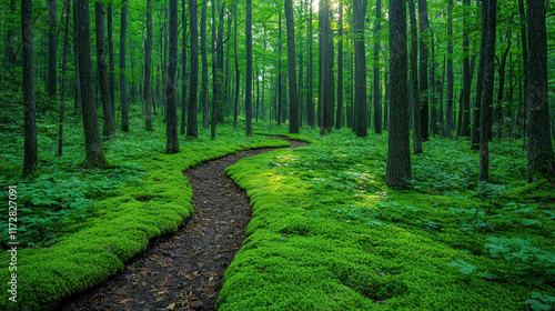 © AbdulHakim, Obraz premium Winding moss path in sunlit forest