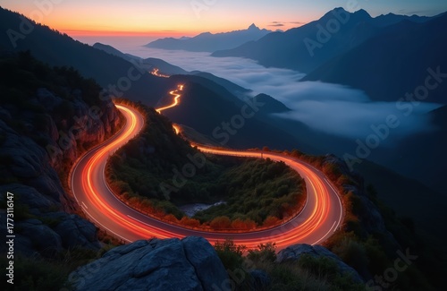 © Viktor, Fototapeta premium Winding mountain road at dusk with car light trails. Headlights, taillights create orange streaks on highway through hills. Fog fills valley below majestic peaks. Landscape shows fast night travel.