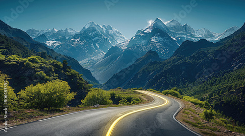 Naklejka premium Winding mountain road stretching into the distance, towering snow-capped...