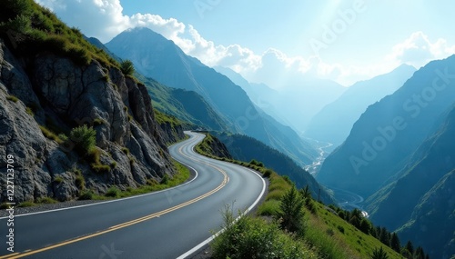 Fototapeta premium Winding mountain road with sharp turns, steep drops , road trip, sky