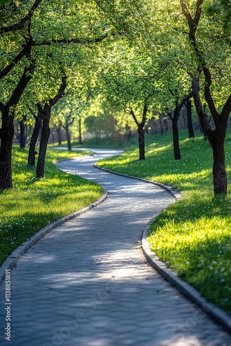 © Boris, Naklejka premium Winding park path under blooming trees in spring light