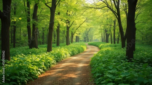 Obraz premium Winding Path in Lush Spring Forest with Sunlight