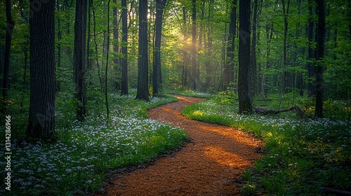 © pete99, Fototapeta premium Winding path in sunlit forest at dawn