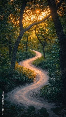 Fototapeta premium Winding path through a forest, bathed in golden sunlight, lush foliage