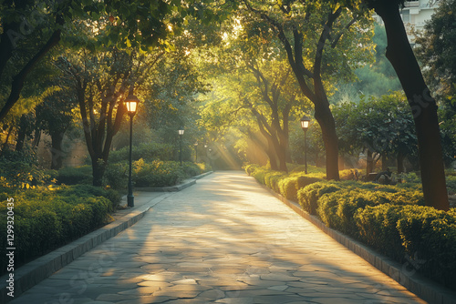 © Ala, Obraz premium Winding path through a lush green park bathed in golden morning light