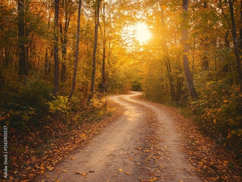 © Hafiz, Obraz premium Winding path through autumn forest with forced perspective and golden hour lighting and copy space above
