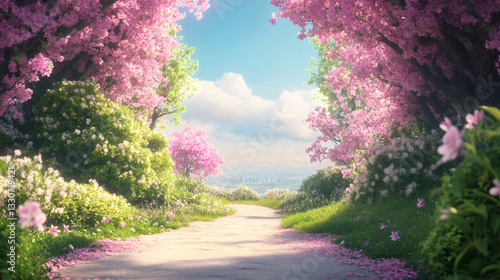 Naklejka premium Winding path through blossoming trees leading toward urban skyline during vibrant spring scenery