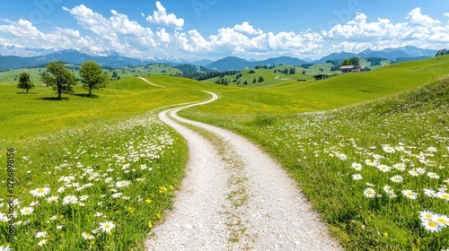 Naklejka premium Winding path through daisy field, mountain backdrop, sunny day, idyllic...