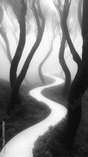 Naklejka premium Winding Path Through Dense Fog in Ancient Forest with Twisted Trees Surrounded by Mystery and Intrigue