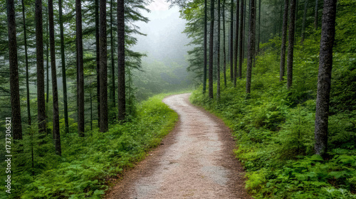 Fototapeta premium Winding path through foggy evergreen forest creates serene atmosphere