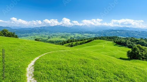 Fototapeta premium Winding path through green hills, mountain backdrop, sunny day, scenic...