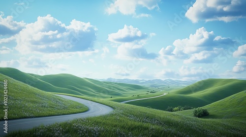 Fototapeta premium Winding Path Through Green Hills Under a Bright Blue Sky, Scenic Nature Landscape with Rolling Hills and Clouds, Peaceful Countryside, Generated AI