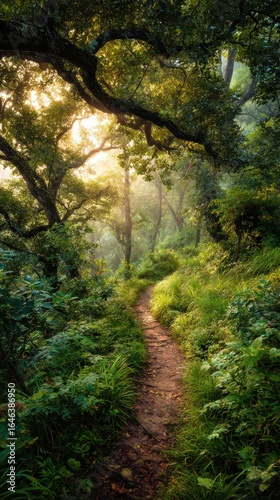 © Pixel Town, Naklejka premium Winding Path Through Lush Green Forest at Sunrise