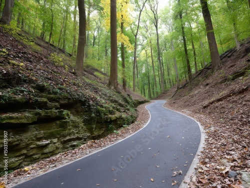 Fototapeta premium Winding path through lush green forest nature trail scenic landscape tranquil environment autumn foliage viewpoint