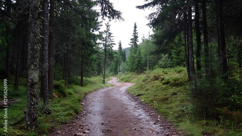 Fototapeta premium Winding Path Through Lush Green Forest Surrounded by Majestic Trees in...