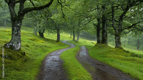 © Yopi, Fototapeta premium Winding Path Through Lush Green Landscape Under Misty Sky