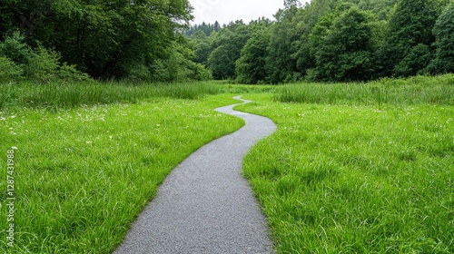 Obraz premium Winding path through lush green meadow, forest backdrop