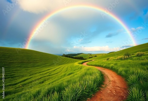 Naklejka premium Winding path through lush green meadow, vibrant rainbow arching overhead, tranquil, adventure