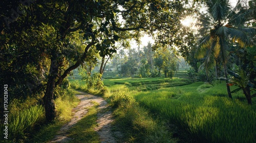 Obraz premium Winding path through lush green rice fields, bright sunlight filters through trees overhead