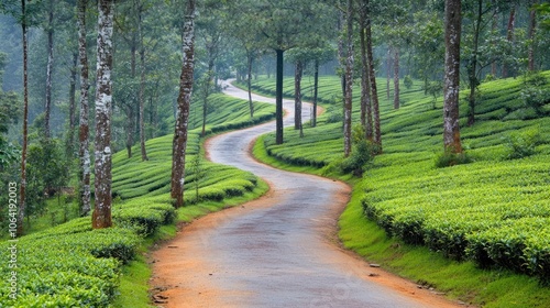 Fototapeta premium Winding Path Through Lush Misty Tea Plantation