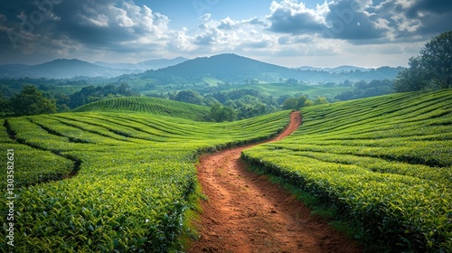 Fototapeta premium Winding path through lush tea fields, mountains in background, tranquil scenery