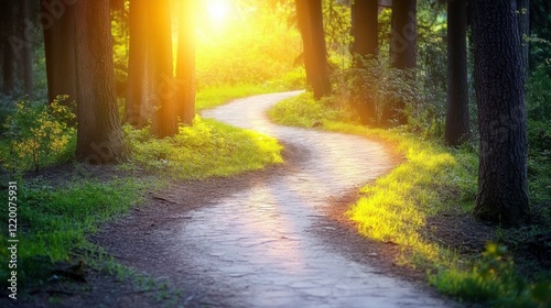 © MyStockz, Fototapeta premium Winding Path Through Trees at Golden Hour Light