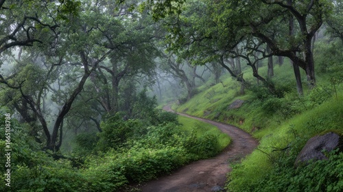 © Yusuf, Fototapeta premium Winding path through verdant forest, misty atmosphere