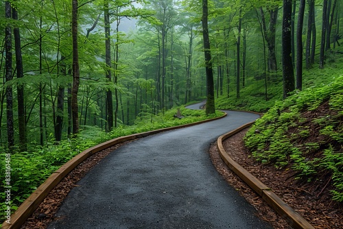 Obraz premium Winding Paved Path Through A Misty Green Forest