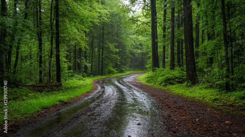Fototapeta premium Winding rain-soaked path through lush forest nature scene tranquil landscape...