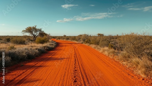 Naklejka premium Winding red dirt road in a remote setting, designed as a UI backdrop for...