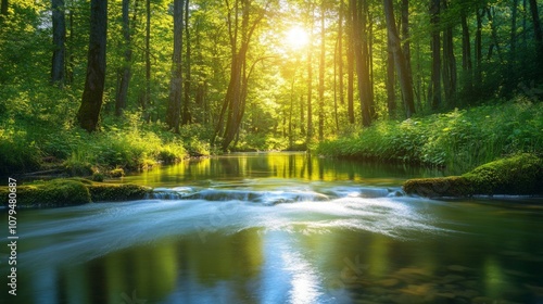 Fototapeta premium Winding River through Lush Summer Forest, a serene waterway meanders amid vibrant greenery, sunlight dances on the surface, showcasing nature's tranquil beauty.