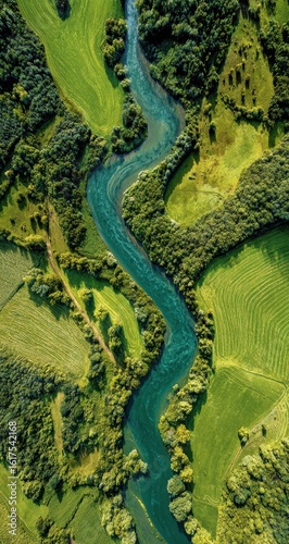 Obraz premium Winding river through vibrant green fields (4)