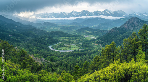 © AbdulHakim, Fototapeta premium Winding river valley, forested slopes, distant snowy peaks under cloudy sky